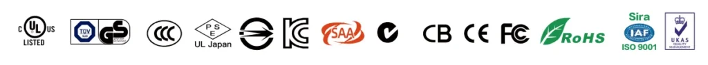 Complete compliance with global standards including UL,CE,FCC,PSE,CB,KC,SAA,BSMI,C-Tick,UKCA,TÜV, GS,Sira,CCC,RoHS certifications